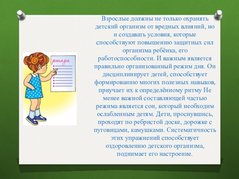 и создавать условия, которые способствуют повышению защитных сил организма ребёнка, его работоспособности. И важным является правильно организованный режим дня. Он дисциплинирует детей, способствует формированию многих полезных навыков, приучает их к определённому ритму Не менее важной составляющей частью режима является сон, который необходим ослабленным детям. Дети, проснувшись, проходят по ребристой доске, дорожке с пуговицами, камушками. Систематичность этих упражнений способствует оздоровлению детского организма, поднимает его настроение.