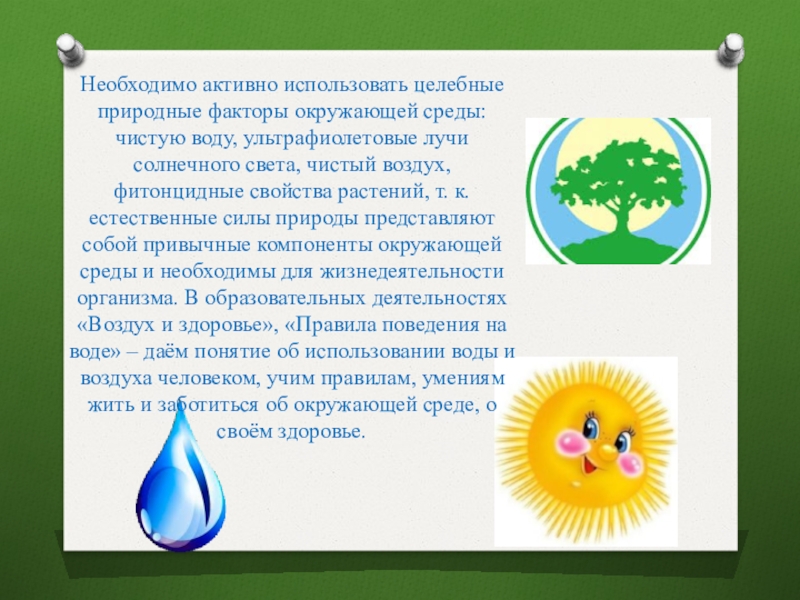 лучи солнечного света, чистый воздух, фитонцидные свойства растений, т. к. естественные силы природы представляют собой привычные компоненты окружающей среды и необходимы для жизнедеятельности организма. В образовательных деятельностях «Воздух и здоровье», «Правила поведения на воде» – даём понятие об использовании воды и воздуха человеком, учим правилам, умениям жить и заботиться об окружающей среде, о своём здоровье.