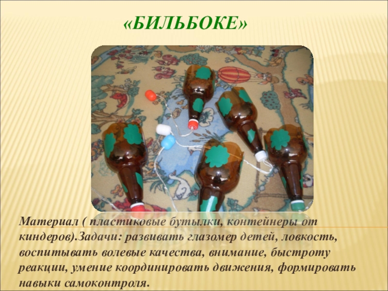 ( пластиковые бутылки, контейнеры от киндеров).Задачи: развивать глазомер детей, ловкость, воспитывать волевые качества, внимание, быстроту реакции, умение координировать движения, формировать навыки самоконтроля.