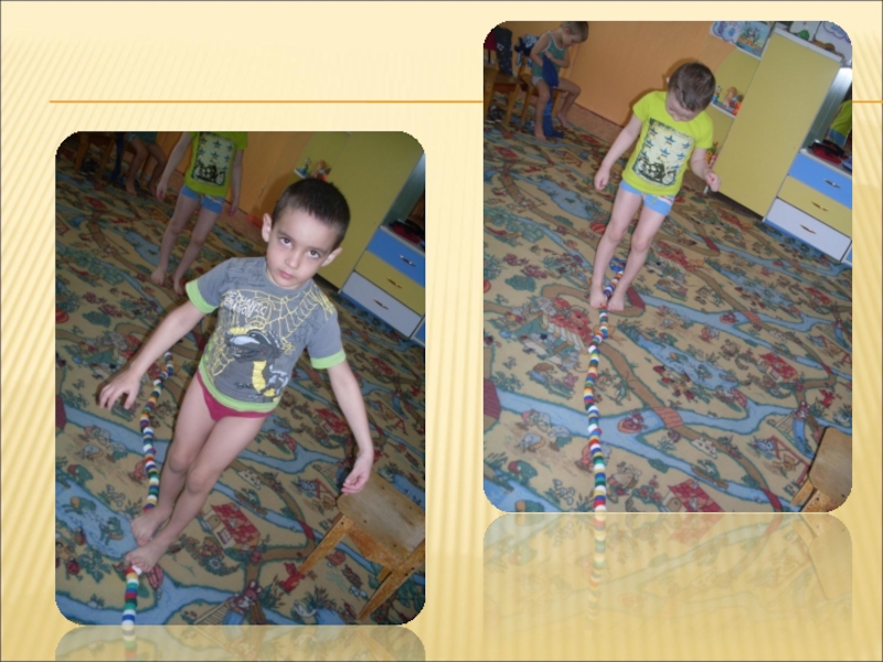 нить. Задачи: используется для ходьбы прямо и боком, сохраняя равновесие и осанку, для подлезания в подвижных играх.