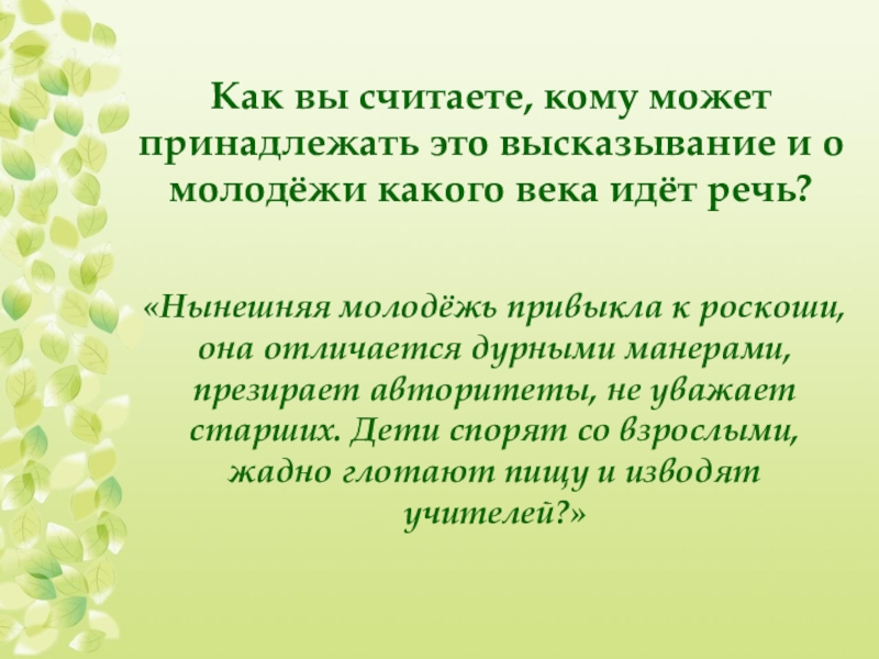 «Нынешняя молодёжь привыкла к роскоши, она отличается дурными манерами, презирает авторитеты, не уважает старших. Дети спорят со взрослыми, жадно глотают пищу и изводят учителей?»
