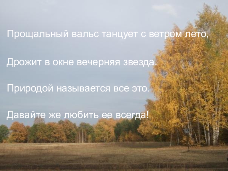 Прощальный вальс танцует с ветром лето,      Дрожит в окне вечерняя звезда. Природой