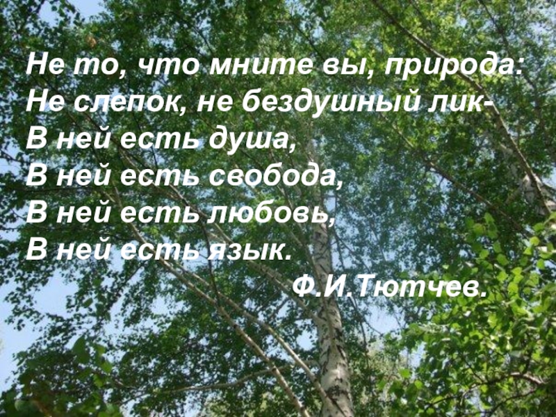 Не то, что мните вы, природа: Не слепок, не бездушный лик- В ней есть душа, В ней есть свобода, В ней есть любовь, В ней есть язык.