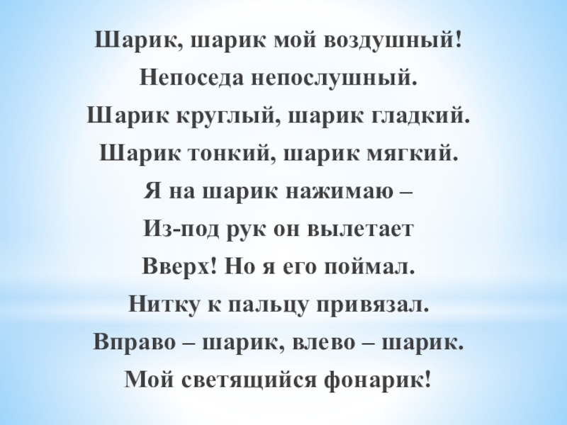 Шарик, шарик мой воздушный!Непоседа непослушный.Шарик круглый, шарик гладкий.Шарик тонкий, шарик мягкий.Я на шарик нажимаю – Из-под рук