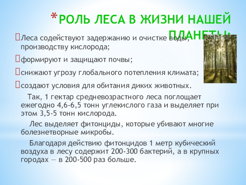 Благодаря действию фитонцидов 1 метр кубический воздуха в лесу содержит 200-300 бактерий, а в крупных городах — в 200-500 раз больше.
