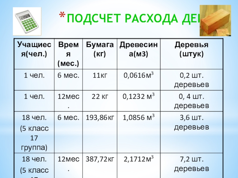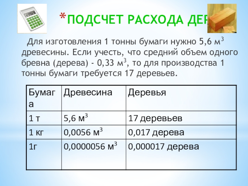 Слайд 10ПОДСЧЕТ РАСХОДА ДЕРЕВА