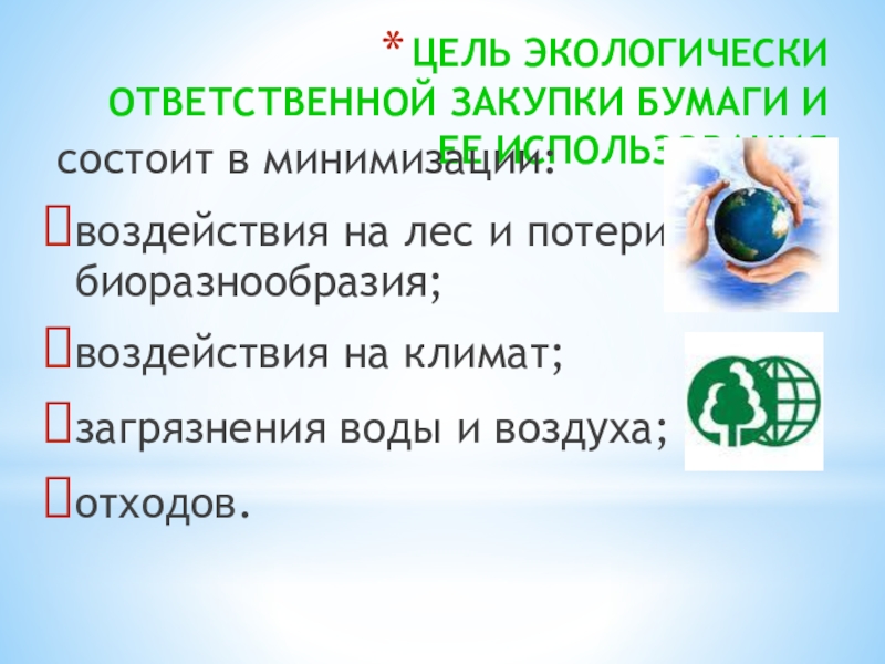 Слайд 15Цель экологически ответственной закупки бумаги и ее использования