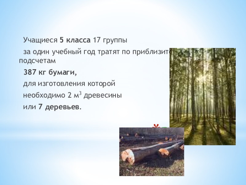 м3 древесины. Если учесть, что средний объем одного бревна (дерева) - 0,33 м3, то для производства 1 тонны бумаги требуется 17 деревьев.