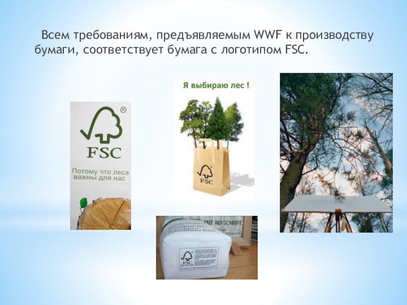 Слайд 17 Всем требованиям, предъявляемым WWF к производству бумаги, соответствует бумага