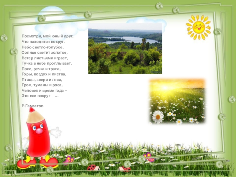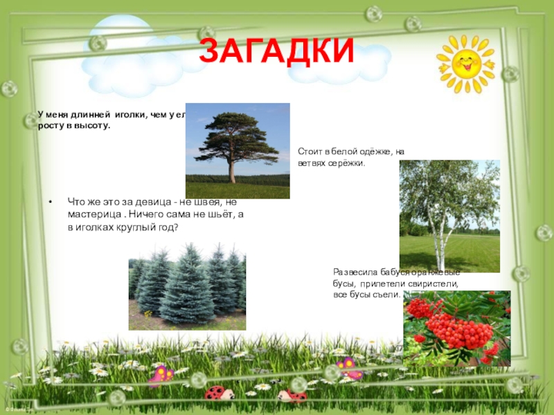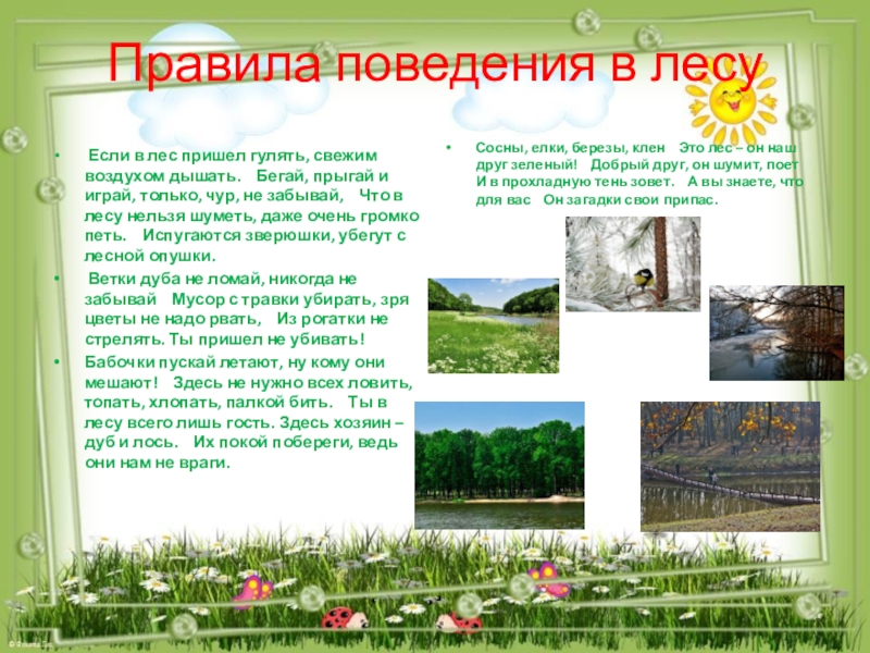 Сосны, елки, березы, клен Это лес – он наш друг зеленый! Добрый друг, он шумит, поет И в прохладную тень зовет. А вы знаете, что для вас Он загадки свои припас.