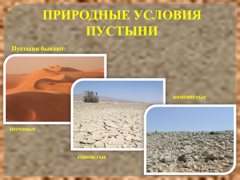 В песчаной пустыне есть барханы – валы из песка, а в глиняной – такыры – растрескавшиеся участки земли.
