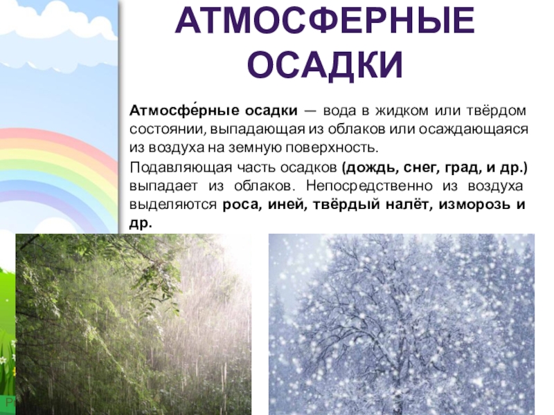 Подавляющая часть осадков (дождь, снег, град, и др.) выпадает из облаков. Непосредственно из воздуха выделяются роса, иней, твёрдый налёт, изморозь и др.