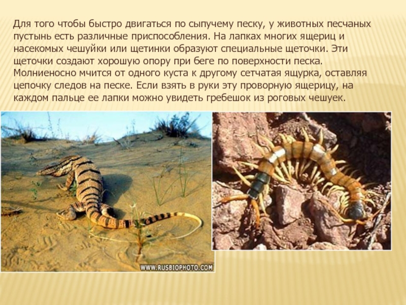 пустынь есть различные приспособления. На лапках многих ящериц и насекомых чешуйки или щетинки образуют специальные щеточки. Эти щеточки создают хорошую опору при беге по поверхности песка. Молниеносно мчится от одного куста к другому сетчатая ящурка, оставляя цепочку следов на песке. Если взять в руки эту проворную ящерицу, на каждом пальце ее лапки можно увидеть гребешок из роговых чешуек.
