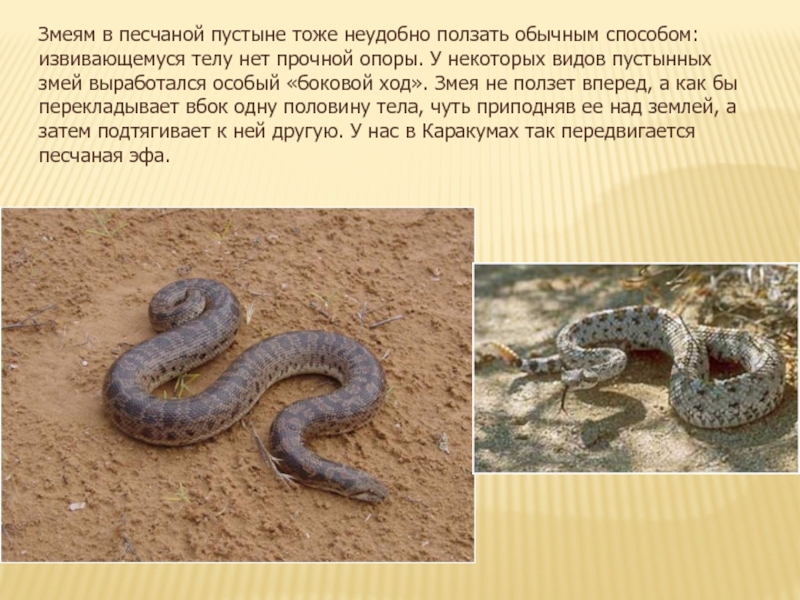 Слайд 21Змеям в песчаной пустыне тоже неудобно ползать обычным способом: извивающемуся телу
