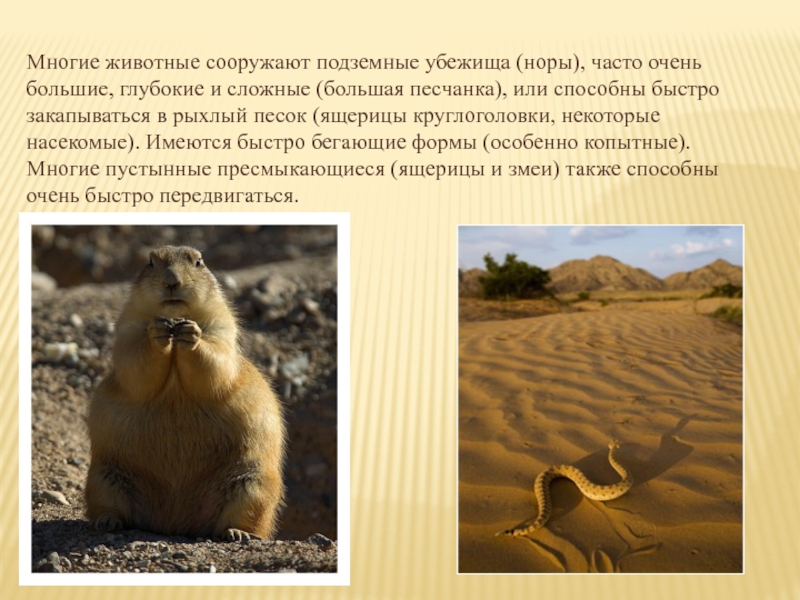 сложные (большая песчанка), или способны быстро закапываться в рыхлый песок (ящерицы круглоголовки, некоторые насекомые). Имеются быстро бегающие формы (особенно копытные). Многие пустынные пресмыкающиеся (ящерицы и змеи) также способны очень быстро передвигаться.