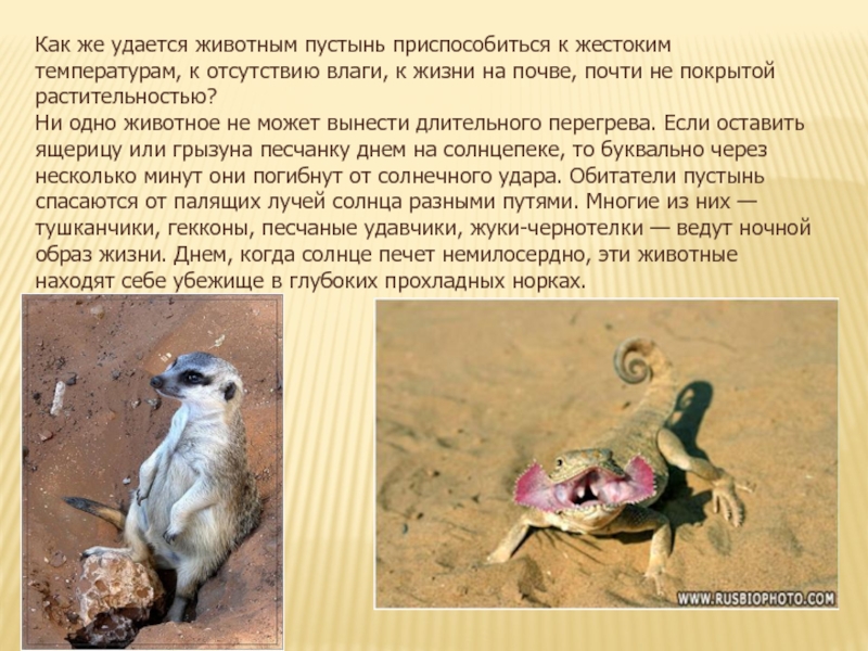 Слайд 16Как же удается животным пустынь приспособиться к жестоким температурам, к отсутствию