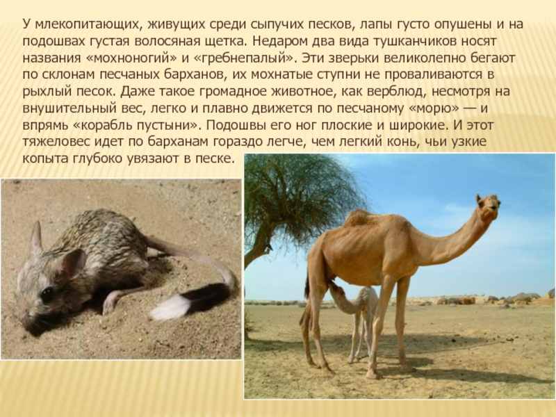 Слайд 19У млекопитающих, живущих среди сыпучих песков, лапы густо опушены и на