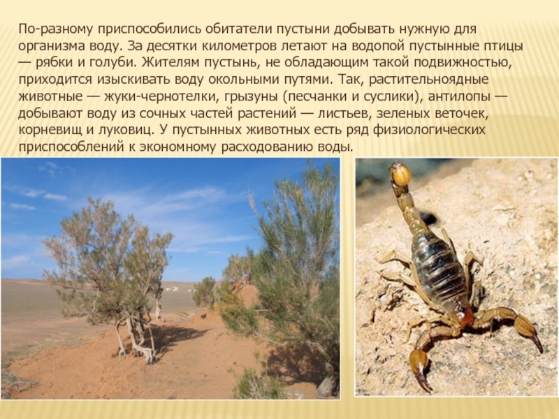 Слайд 18По-разному приспособились обитатели пустыни добывать нужную для организма воду. За десятки
