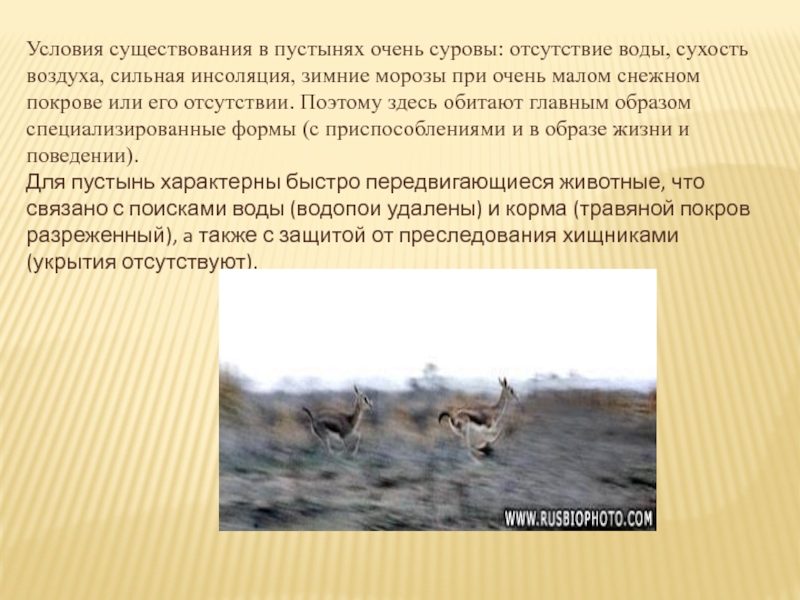 Для пустынь характерны быстро передвигающиеся животные, что связано с поисками воды (водопои удалены) и корма (травяной покров разреженный), a также с защитой от преследования хищниками (укрытия отсутствуют).