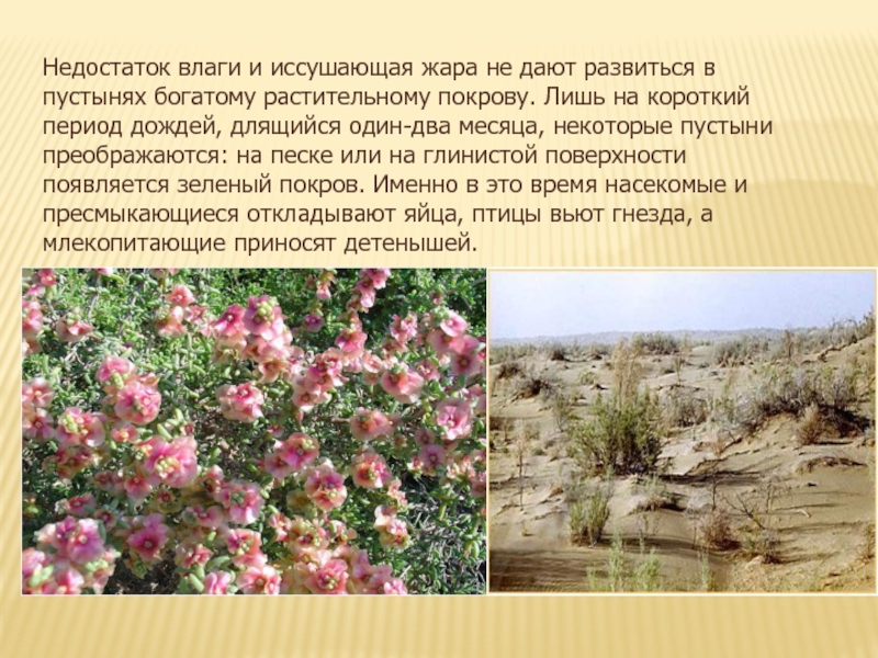 Слайд 15Недостаток влаги и иссушающая жара не дают развиться в пустынях богатому