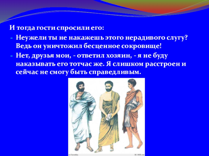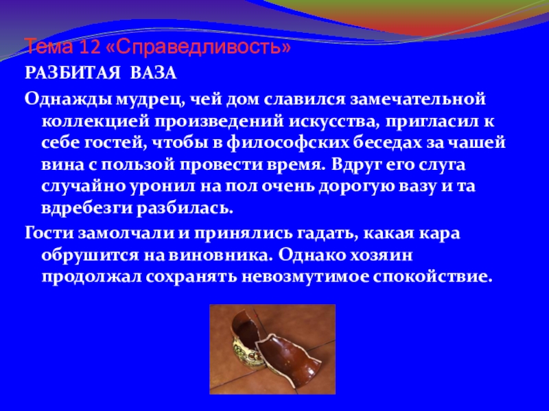 искусства, пригласил к себе гостей, чтобы в философских беседах за чашей вина с пользой провести время. Вдруг его слуга случайно уронил на пол очень дорогую вазу и та вдребезги разбилась.