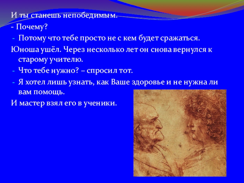 - Возьми меня в ученики,- попросил молодой человек. – Я хочу стать сильным и непобедимым.