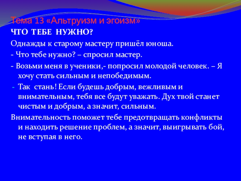 Слайд 14Тема 13 «Альтруизм и эгоизм»