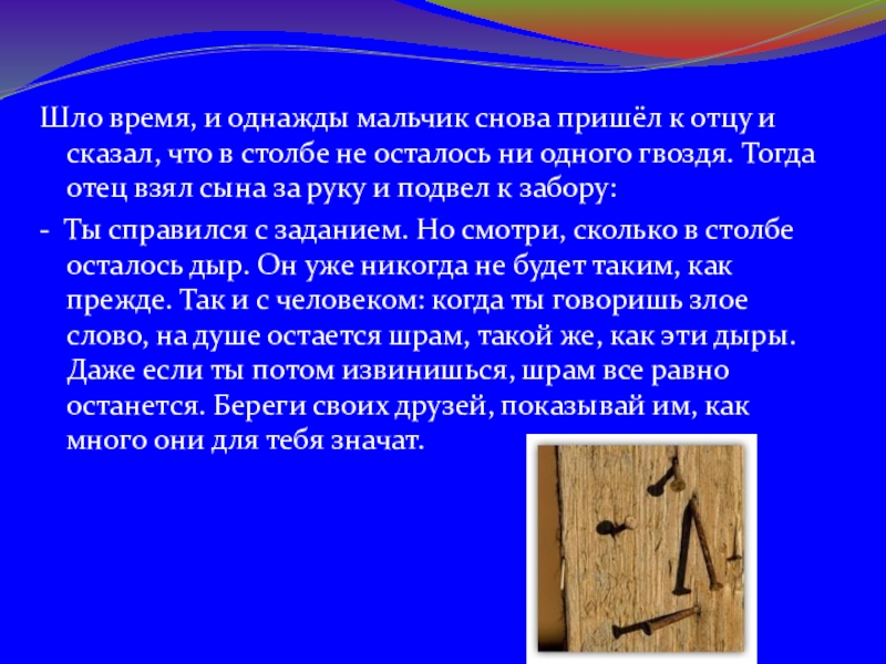 - Ты справился с заданием. Но смотри, сколько в столбе осталось дыр. Он уже никогда не будет таким, как прежде. Так и с человеком: когда ты говоришь злое слово, на душе остается шрам, такой же, как эти дыры. Даже если ты потом извинишься, шрам все равно останется. Береги своих друзей, показывай им, как много они для тебя значат.