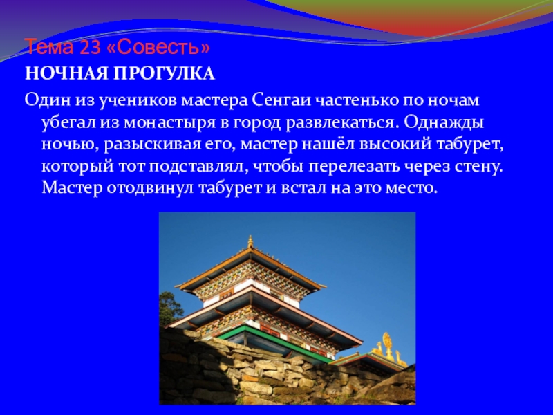 убегал из монастыря в город развлекаться. Однажды ночью, разыскивая его, мастер нашёл высокий табурет, который тот подставлял, чтобы перелезать через стену. Мастер отодвинул табурет и встал на это место.