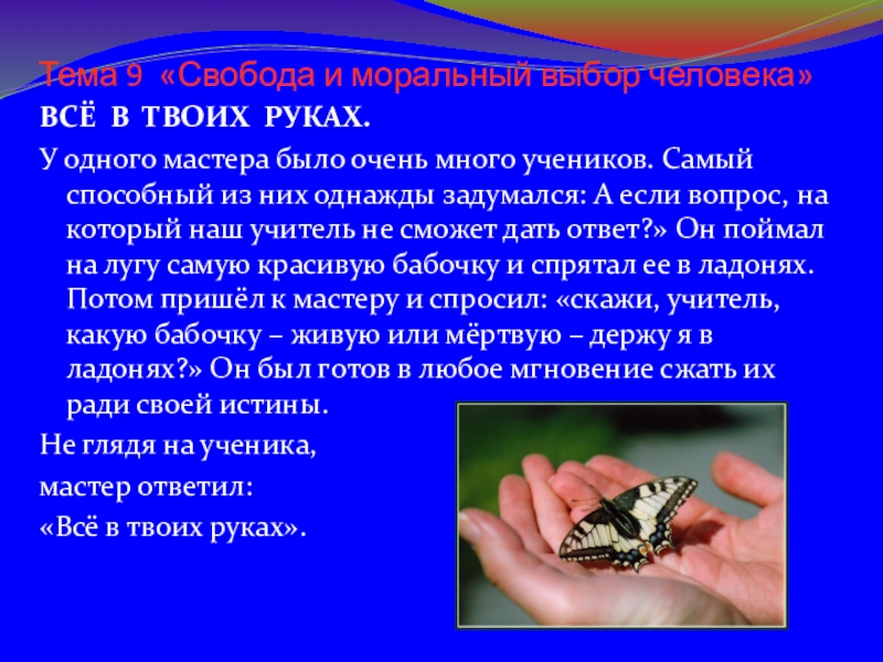 мастера было очень много учеников. Самый способный из них однажды задумался: А если вопрос, на который наш учитель не сможет дать ответ?» Он поймал на лугу самую красивую бабочку и спрятал ее в ладонях. Потом пришёл к мастеру и спросил: «скажи, учитель, какую бабочку – живую или мёртвую – держу я в ладонях?» Он был готов в любое мгновение сжать их ради своей истины.