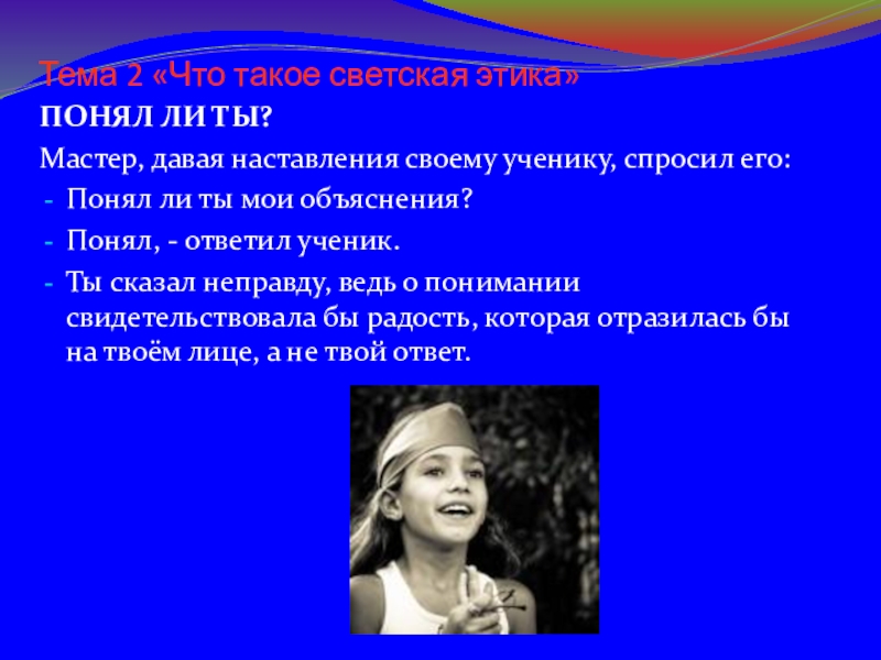Ты сказал неправду, ведь о понимании свидетельствовала бы радость, которая отразилась бы на твоём лице, а не твой ответ.