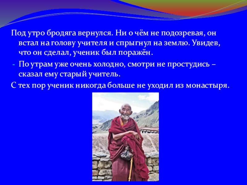 Слайд 20Под утро бродяга вернулся. Ни о чём не подозревая, он встал