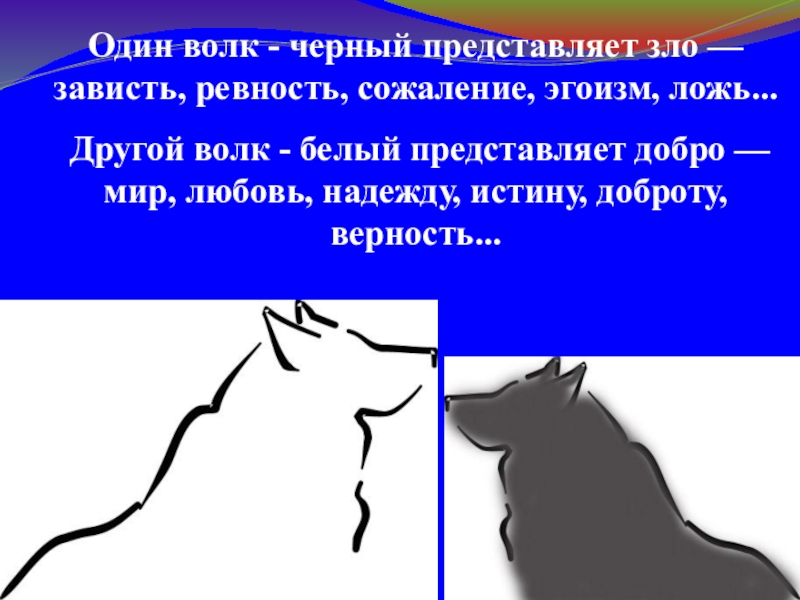 Слайд 4Один волк - черный представляет зло — зависть, ревность, сожаление, эгоизм,
