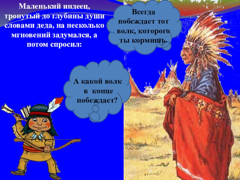 Слайд 5Маленький индеец, тронутый до глубины души словами деда, на несколько мгновений