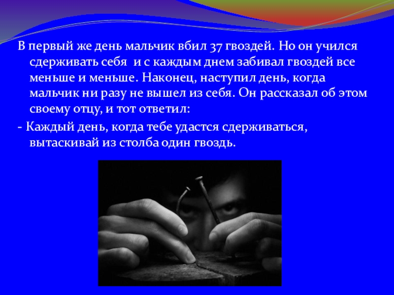сдерживать себя и с каждым днем забивал гвоздей все меньше и меньше. Наконец, наступил день, когда мальчик ни разу не вышел из себя. Он рассказал об этом своему отцу, и тот ответил: