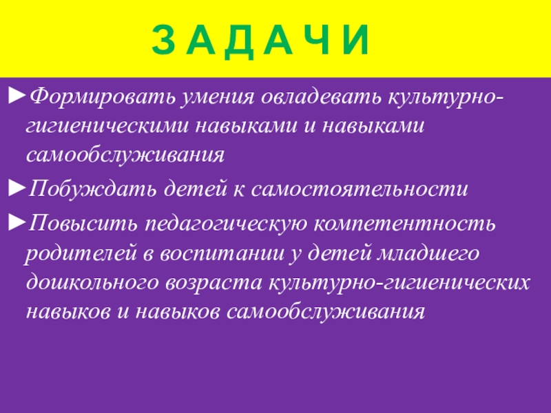 ►Повысить педагогическую компетентность родителей в воспитании у детей младшего дошкольного возраста культурно-гигиенических навыков и навыков самообслуживания
