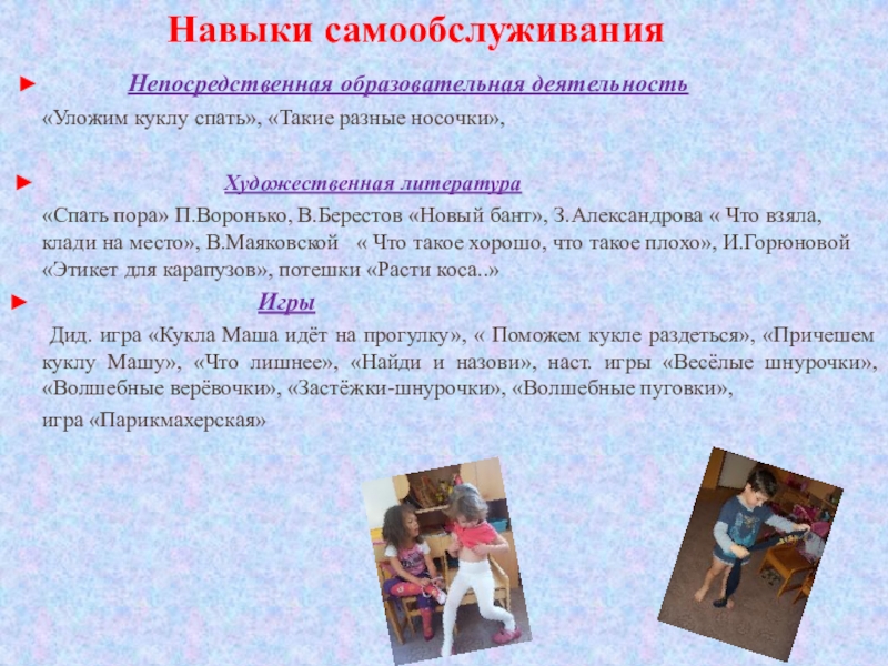 Дид. игра «Кукла Маша идёт на прогулку», « Поможем кукле раздеться», «Причешем куклу Машу», «Что лишнее», «Найди и назови», наст. игры «Весёлые шнурочки», «Волшебные верёвочки», «Застёжки-шнурочки», «Волшебные пуговки»,