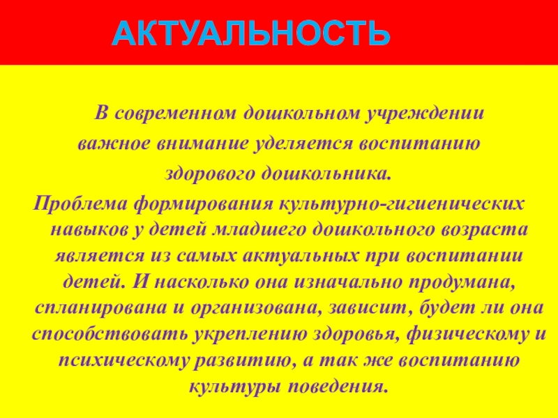 Проблема формирования культурно-гигиенических навыков у детей младшего дошкольного возраста является из самых актуальных при воспитании детей. И насколько она изначально продумана, спланирована и организована, зависит, будет ли она способствовать укреплению здоровья, физическому и психическому развитию, а так же воспитанию культуры поведения.