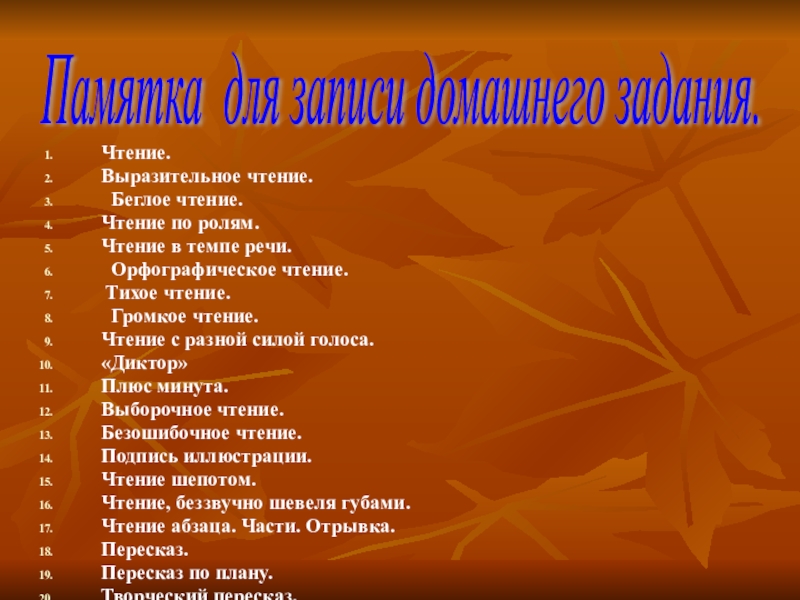 15. Чтение «выше нормы» (в основном это домашнее задание, когда ученик, хорошо зная свою норму чтения незнакомого текста, путём тренировок дома набирает 10-15 слов, например: норма чтения незнакомого текста составляет 40 слов, значит, он должен прочитать с нормой 50- 55 слов в минуту.)