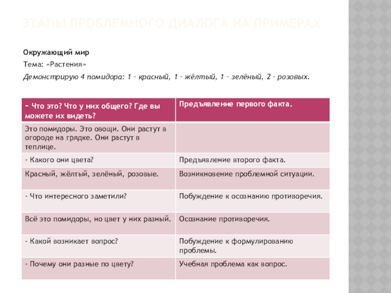 Этапы проблемного диалога на примерахОкружающий мирТема: «Растения»Демонстрирую 4 помидора: 1 – красный, 1 – жёлтый, 1 –