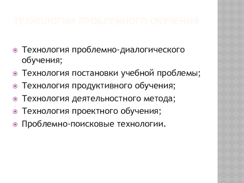Технологии проблемного обученияТехнология проблемно-диалогического обучения;Технология постановки учебной проблемы;Технология продуктивного обучения;Технология деятельностного метода;Технология проектного обучения;Проблемно-поисковые технологии.