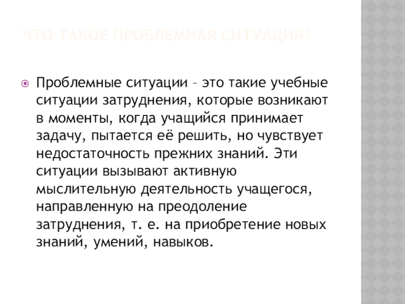 Что такое проблемная ситуация?Проблемные ситуации – это такие учебные ситуации затруднения, которые возникают в моменты, когда учащийся