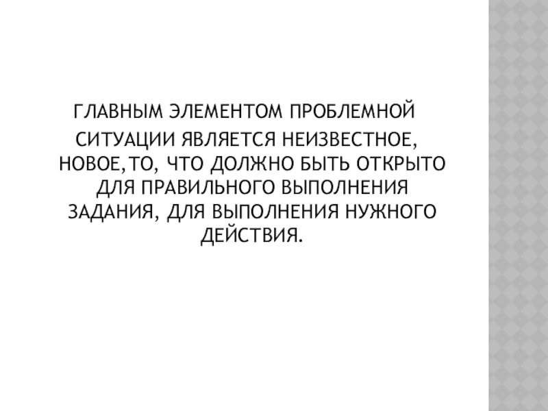 ГЛАВНЫМ ЭЛЕМЕНТОМ ПРОБЛЕМНОЙ СИТУАЦИИ ЯВЛЯЕТСЯ НЕИЗВЕСТНОЕ, НОВОЕ,ТО, ЧТО ДОЛЖНО БЫТЬ ОТКРЫТО ДЛЯ ПРАВИЛЬНОГО ВЫПОЛНЕНИЯ ЗАДАНИЯ, ДЛЯ ВЫПОЛНЕНИЯ