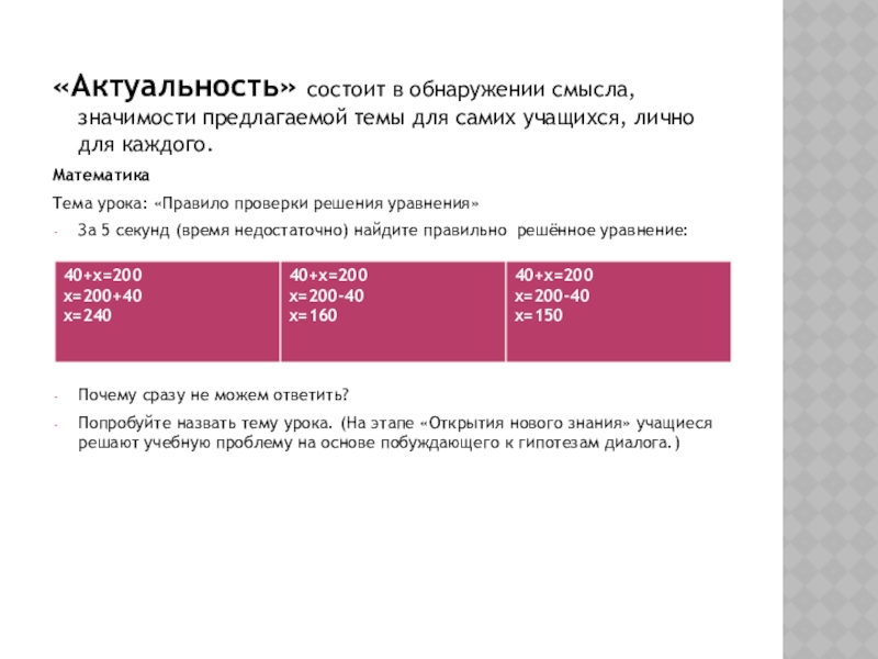 «Актуальность» состоит в обнаружении смысла, значимости предлагаемой темы для самих учащихся, лично для каждого. МатематикаТема урока: «Правило