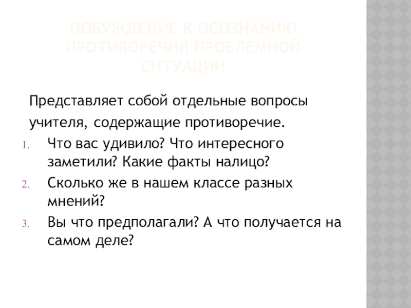 Слайд 6Побуждение к осознанию противоречия проблемной ситуации