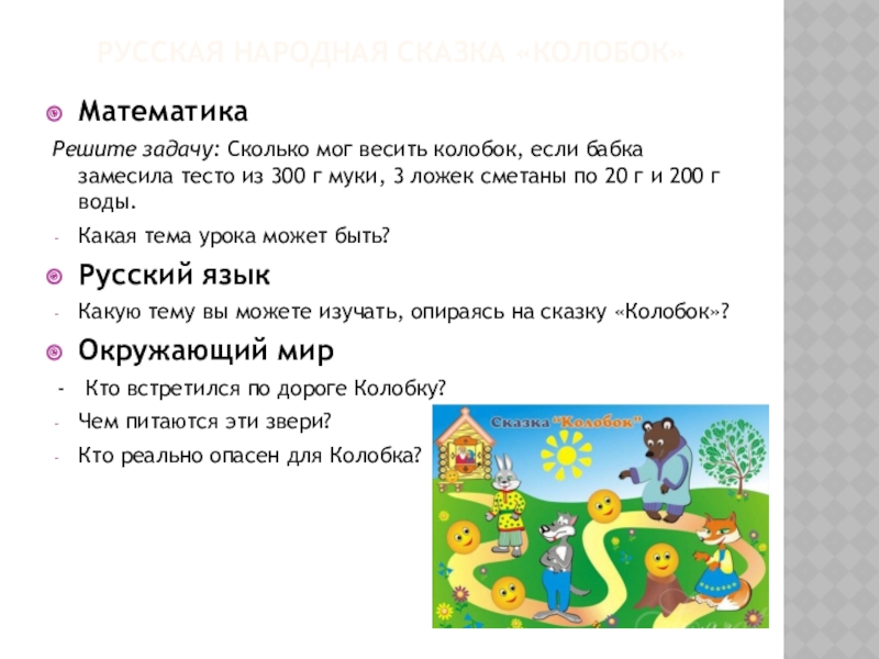 Русская народная сказка «колобок»МатематикаРешите задачу: Сколько мог весить колобок, если бабка замесила тесто из 300 г муки,