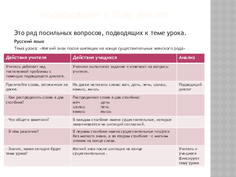 Подводящий к теме диалогЭто ряд посильных вопросов, подводящих к теме урока.Русский языкТема урока: «Мягкий знак после шипящих