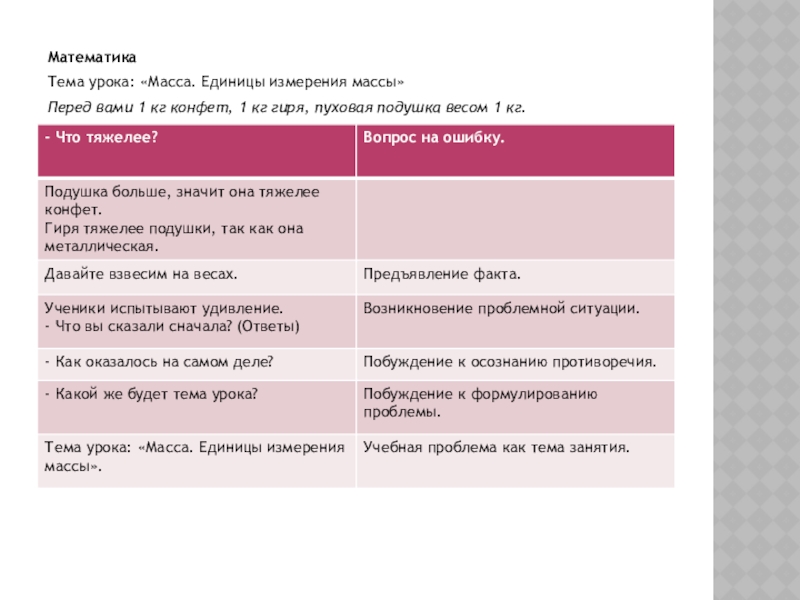 МатематикаТема урока: «Масса. Единицы измерения массы»Перед вами 1 кг конфет, 1 кг гиря, пуховая подушка весом 1