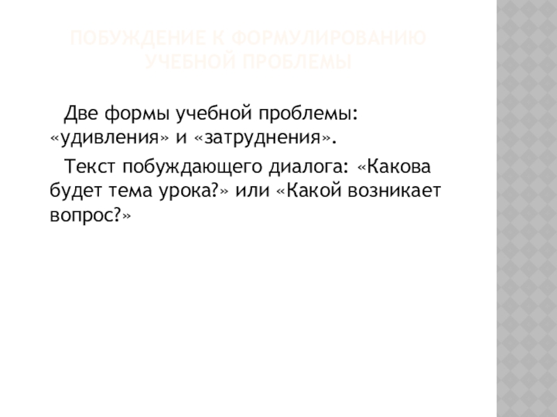 Текст побуждающего диалога: «Какова будет тема урока?» или «Какой возникает вопрос?»