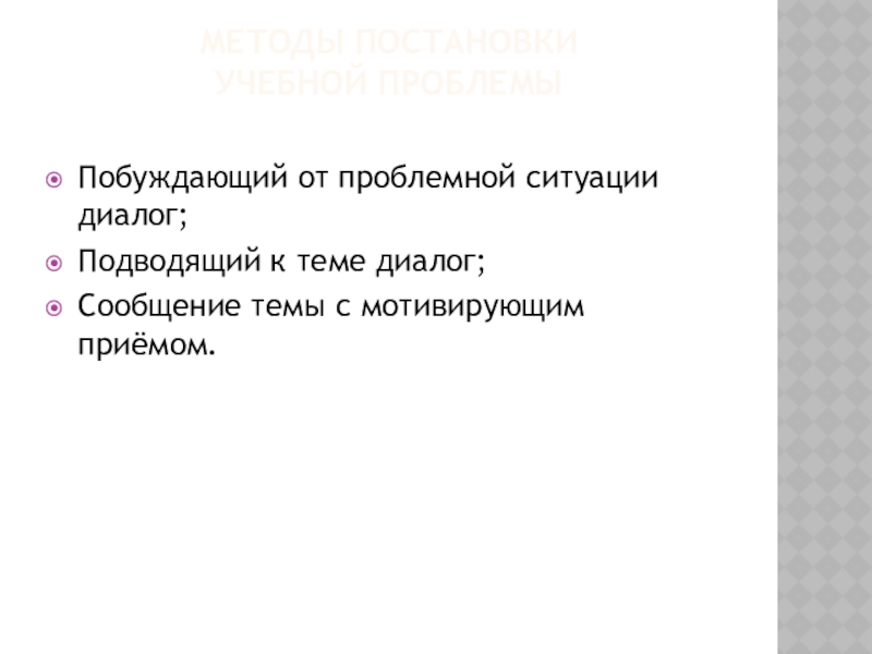 Методы постановки  учебной проблемыПобуждающий от проблемной ситуации диалог;Подводящий к теме диалог;Сообщение темы с мотивирующим приёмом.